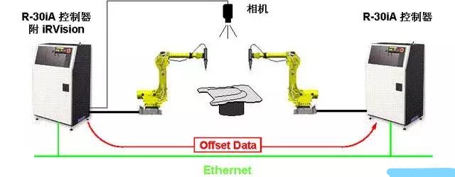 通過此功能,未附有 iRVision 視覺系統的機器人可以通過網絡調用附有 iRVision 視覺系統的機器人的偏移檢測數據。