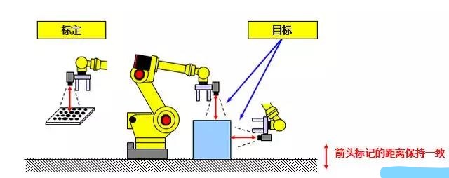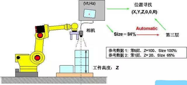 視覺堆垛程序通過相機視野內目標比例的變化來估算目標的高度并引導機器人的運動補償目標的偏移,不但包括X軸,Y軸和X-Y平面旋轉度R,也同時包括Z軸。
