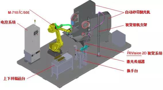 水龍頭智能打磨拋光應用系統由M-710iC/50E機器人、自動砂帶拋光機、iRVision 2D視覺系統、換手臺、激光傳感器、上下料輸送臺以及電控系統組成;該套系統是上海發那科推出的新型智能打磨拋光系統,旨在解決不同砂帶機之間的程序轉移,工件模型誤差以及裝夾誤差導致的系統不穩定問題,幫助客戶提高生產效率,提升打磨產品的穩定性。